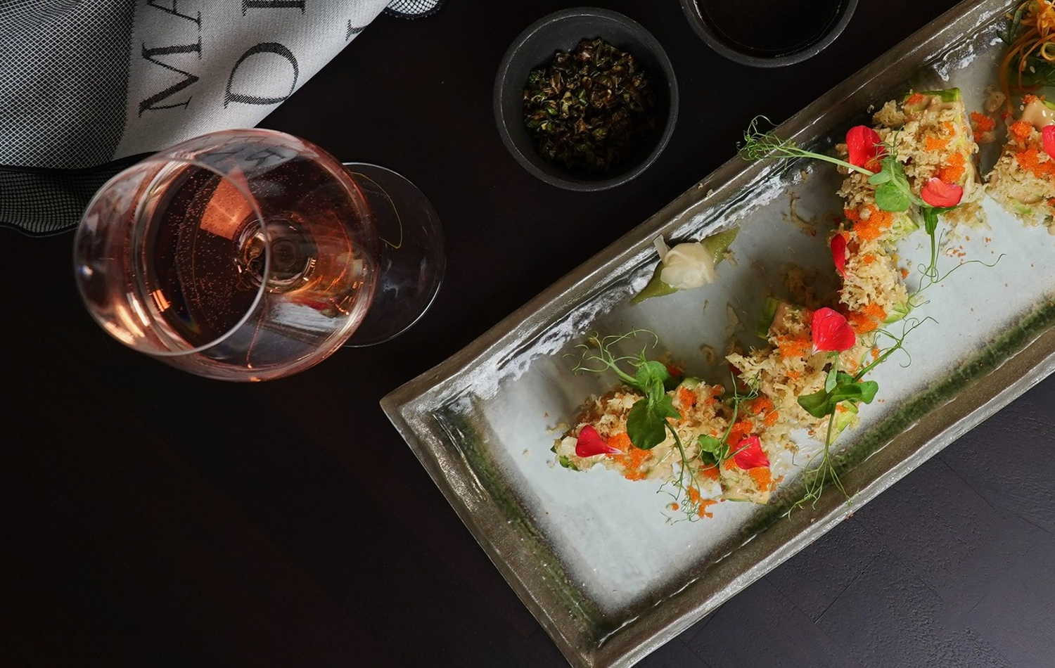 Lomo de totoaba de cultivo con costra de alcaparras y salsa guinataan con miso, acompañado de ensalada de mango y arroz jazmín.
